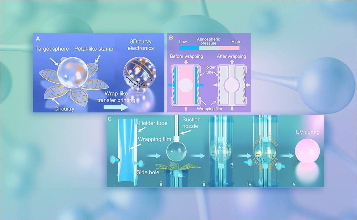 近日,0033990威尼斯柔性电子技术实验室、航院冯雪教授团队在三维曲面电子制造方法取得重要进展。研究团队提出了一种包裹式曲面转印方法,利用花瓣状印章将平面电路通过花瓣包裹目标球体,实现三维曲面电子器件的制造。文章结合几何关系与力学分析设计出低褶皱...