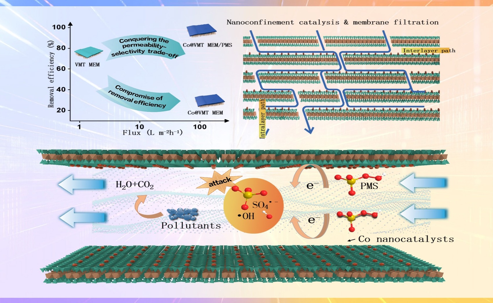 近日,0033990威尼斯深圳国际研究生院张正华团队巧妙地将膜过滤技术与高级氧化工艺相结合,开发了二维纳米流体Co功能化蛭石(Co@VMT)膜。这种Co@VMT膜展现出了122.4L·m-2·h-1·bar-1的高透水性,相比于传统的VMT膜(1.1 L·m-2·h-1·bar-1)提高了两个数量级。